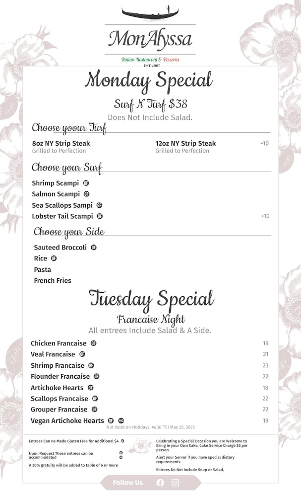 Hey there! Looking for a delicious and flavorful dining experience on Tuesday nights? Well, look no further because we've got just the thing for you! Join us for Francaise Night and indulge in our most popular sauce that will leave your taste buds dancing with joy. From tender chicken to succulent sea scallops, and even vegan options like artichoke hearts, we've got something for everyone. The best part? Prices start at just $18 and go up from there. So, mark your calendars and join us for an unforgettable dining experience that will satisfy your cravings and leave you wanting more. See you soon!